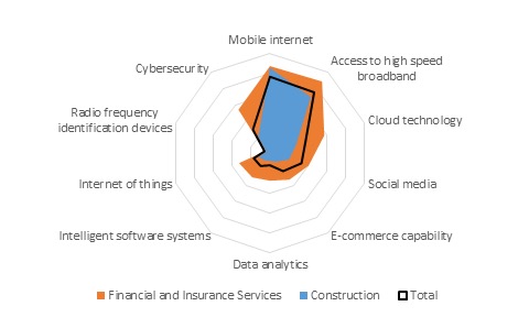 For the first time, we are now able to understand the importance of these different technologies to different sectors. We can compare for example, the extent to which digital technologies are used by say, the construction sector (not very much), with finance (a lot more) — see figure below. We can also understand which technologies are most important to different parts of the economy. Over time, we’ll be able to watch how different technologies impact on the economy as well as locate the digital leaders and laggards.