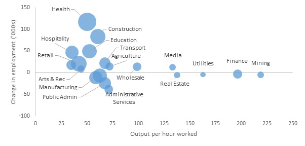 The jobs created in the last year have been typically in sectors with productivity levels that are lower than average (see chart below). The output generated in sectors like health, construction, hospitality, retail and education is lower on an hour by hour basis than sectors like mining and finance — which are not part of the recent jobs boom. This structural shift is partly why productivity is dragging.