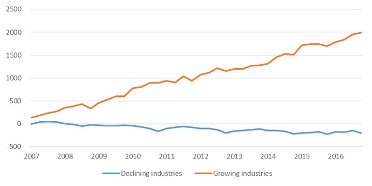 Notes: Declining industries are those that employ less people today than 10 years ago and include agriculture, manufacturing, wholesale trade, media and rental and real estate services. Growing industries are everything else.
