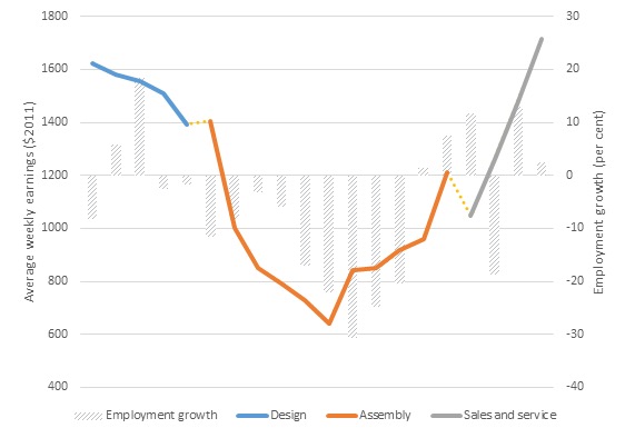 Along the bottom are occupations employed in the manufacturing industry – they relate to design, production and sales. The vertical is their average earnings.