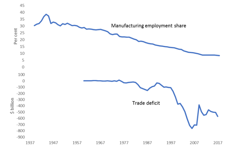 The decline in manufacturing’s contribution to US employment however, stared well before America started running trade deficits. The rate of decline has largely held constant for 70 years.