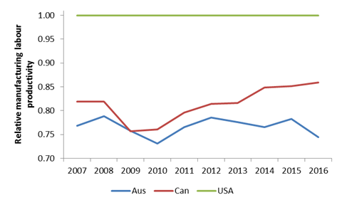 Manufacturing labour productivity, Australia and Canada, relative to USA